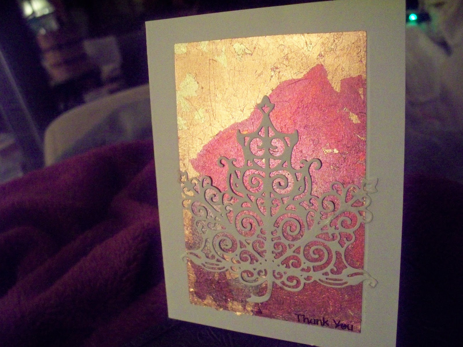 So, now I am trying to get back into the groove here in Ohio, and finding it harder than I would have thought. But appointments need to be made, commitments met, etc. I guess I just find myself daydreaming of the mountains and the western life which I miss so much, that it makes it hard to be very productive. The card which I made (above) reflects some of that beautiful country out there. I used foil gilding to reflect the beautiful, golden Aspen trees which were in peak color in the mountains, along with the various colors of the willow, mountain maple and other low-lying shrubbery that reflected more of a reddish color. The stylized maple leaf die cut in the center of the card represents the foliage in the lower elevations which had not turned into its fall colors yet. And at the very bottom right of the card, in black print are the words "thank you".