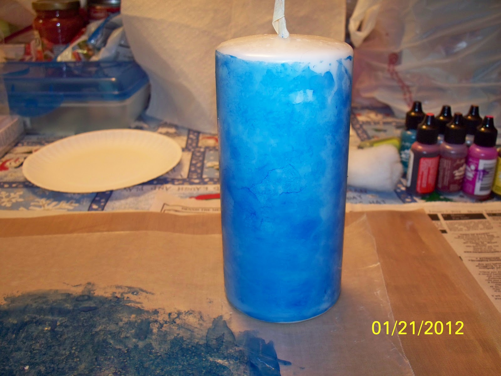 6. Now Stand Candle upright on a clear spot of your Waxed Paper. Squirt a little of same color on the top of the Candle, and use the Cotton to spread and cover this area of the Candle so the entire Candle is now the same color