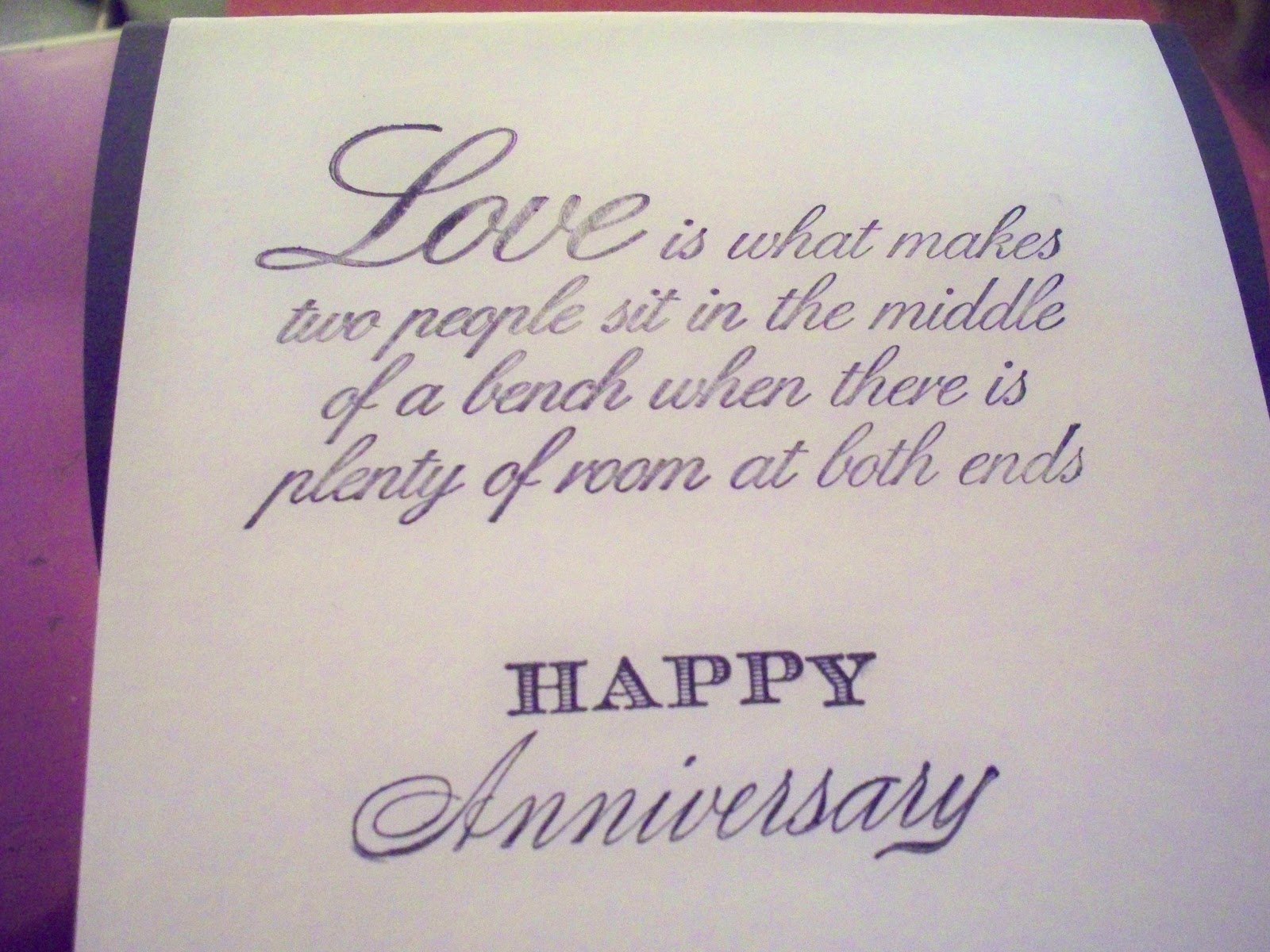 On the inside I used two separate stamps. The first one, the quote, is called "Love Bench Sentiment" Rubber Stamp, and can be found on StampersBest.com! The second stamp is an Anna Griffin stamp that wishes a Happy Anniversary!